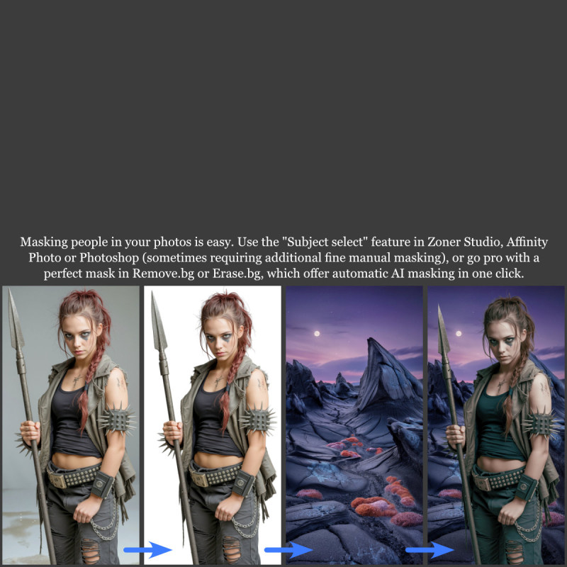 • Maskování fotografovaných lidí, postav i portrétů, je snadné. Použijte funkci AI Odstranit pozadí v Zoner Studiu, nebo Subject select (výběr subjektu) ve Photoshopu nebo Affinity Photo, někdy je nutná dodatečná úprava masky ve vlasech (Refine), nebo maskujte jako profesionálové a získejte perfektní masky v aplikaci Remove.bg nebo Erase.bg, které nabízejí automatické maskování na jedno kliknutí.
