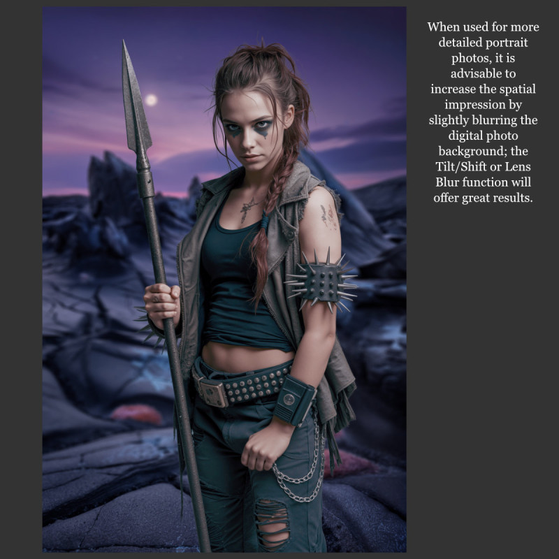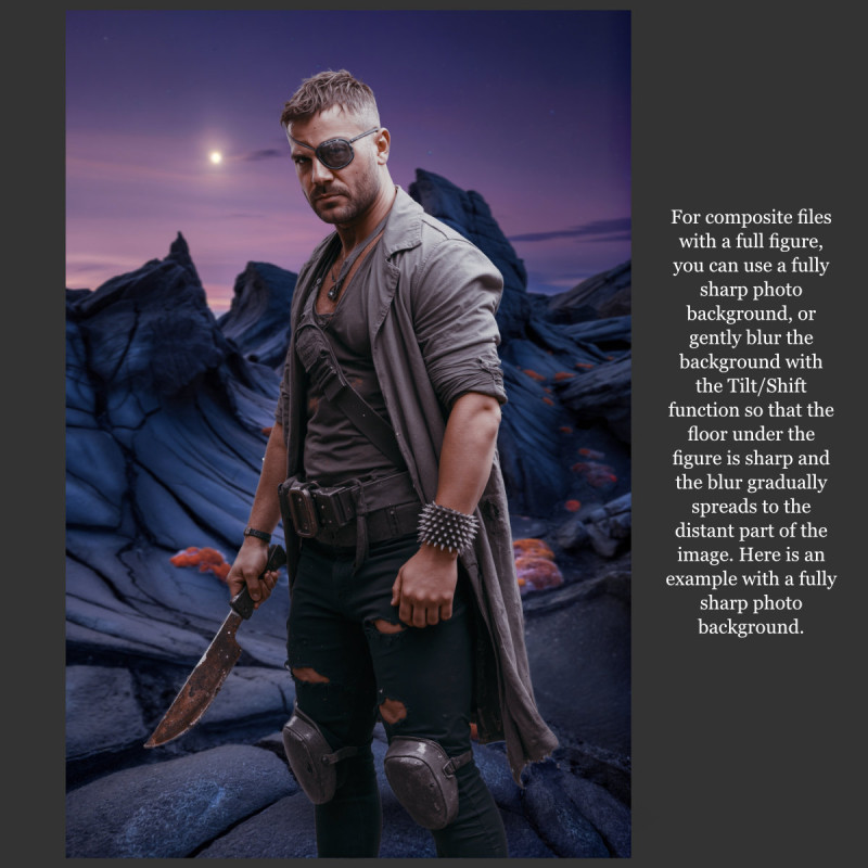• Pro kompozitní soubory s celými postavami můžete použít plně ostré background, nebo použijte jemné rozostření funkcí Tilt/Shift tak, aby virtuální podlaha pod postavou byla ostrá a pozadí se jemně rozostřilo až dále za postavou.