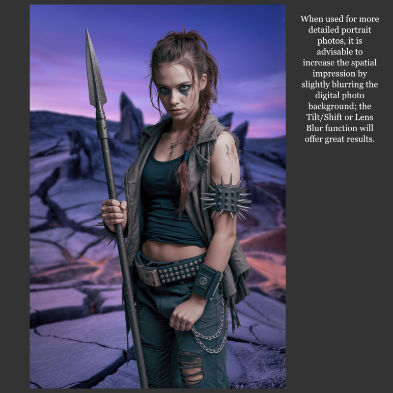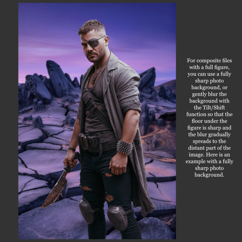 • Pro kompozitní soubory s celými postavami můžete použít plně ostré background, nebo použijte jemné rozostření funkcí Tilt/Shift tak, aby virtuální podlaha pod postavou byla ostrá a pozadí se jemně rozostřilo až dále za postavou.