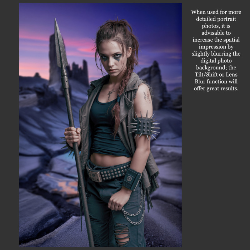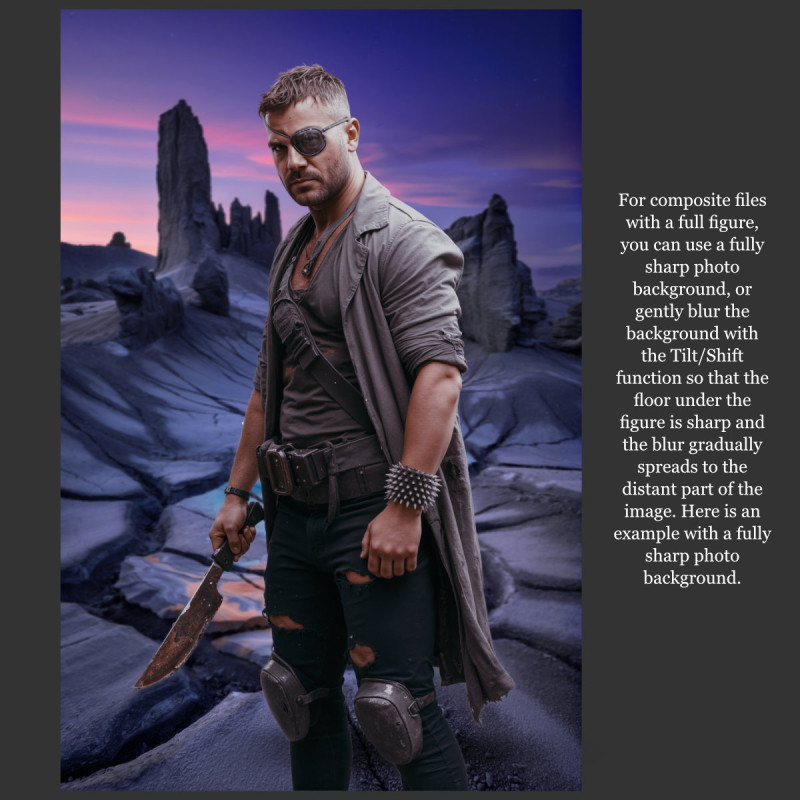 • Pro kompozitní soubory s celými postavami můžete použít plně ostré background, nebo použijte jemné rozostření funkcí Tilt/Shift tak, aby virtuální podlaha pod postavou byla ostrá a pozadí se jemně rozostřilo až dále za postavou.